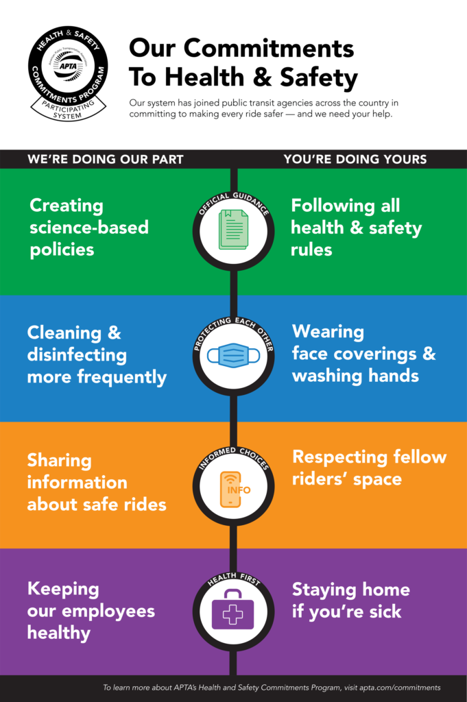 At the outset of the pandemic, APTA members established a Mobility Recovery & Restoration Task Force, which developed a Health & Safety Commitments Program for public transportation agencies to implement in their own communities. The goal was simple: control the spread of COVID-19, keep the riding public and our own workers healthy and safe, and win back public trust. The APTA program consists of four commitments to specific practices and policies for both transit agencies and transit users to follow: