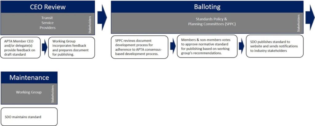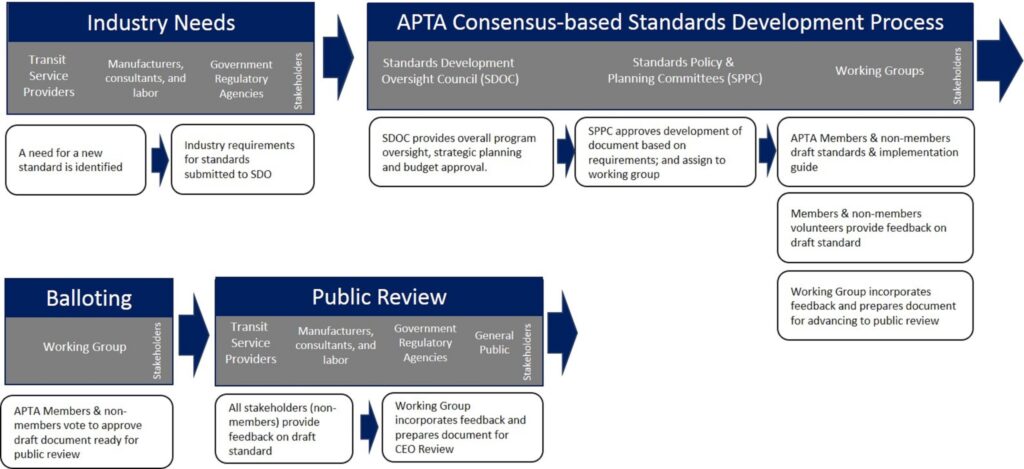APTA develops standards through consensus on a proposed document drafted by its working groups, a consensus body that includes representation from all public transportation industry stakeholders, affected and interested parties. Draft documents are then made available at least 30 days for public review and commenting via APTA’s website. APTA responses to any and all comments submitted through the public review and comment process by incorporating approved changes into the draft document. APTA then gives consideration to and responses to comments submitted by voting member transit agencies. Approved changes are then incorporated into the final draft before completing a final evaluation of the development process by a standards policy and planning committee. The standards policy and planning committee provides the final approval of the document for publishing.